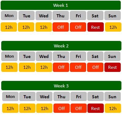 This is one of the most common schedules for employees or workmen not covered under Part IV of the Employment Act . Under a 4/40 schedule, employees work four 10-hour days and take the fifth day off (See example A below).