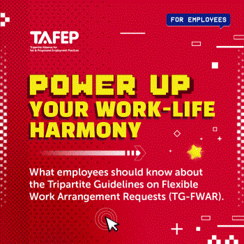 We have appointed Consulting Group – Asia Insight Pte Ltd to conduct an online survey for our ‘Flexible Work Arrangements’ campaign to understand Singaporeans and Singapore PR’s knowledge and perception of FWAs and the Tripartite Guidelines on Flexible Work Arrangement Requests (TG-FWAR) principles.