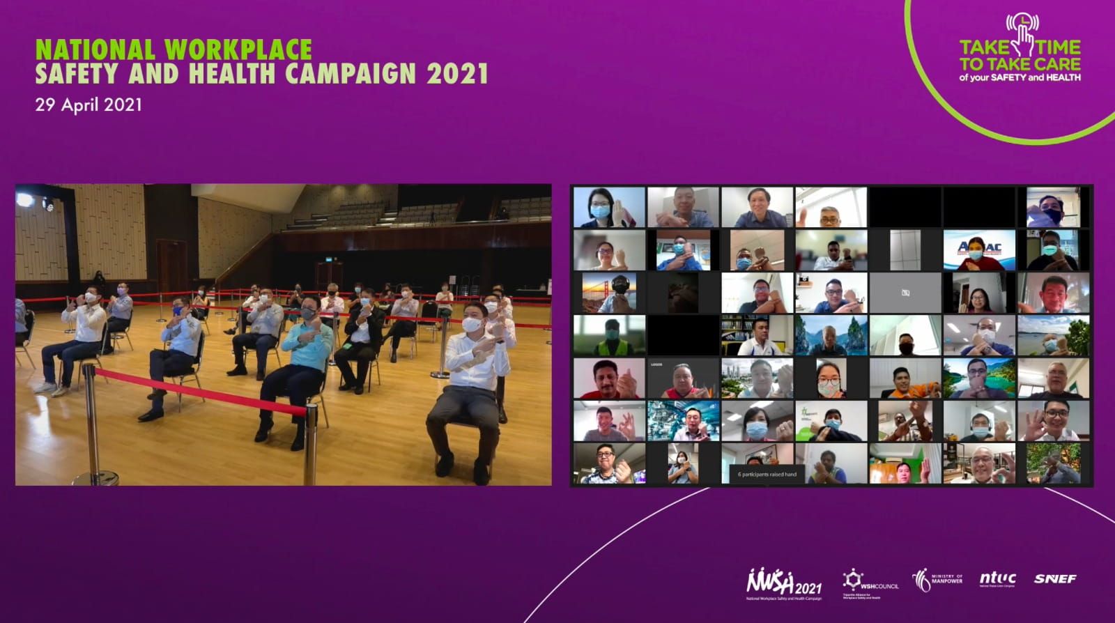 2. One year ago, we organised the Campaign online for the first time in support of the government’s call for safe distancing measures to counter COVID-19. Now, with the safe and progressive resumption of business events, we are launching this year’s National WSH Campaign in a physical format with safe distancing and streamed live to our audience watching on a virtual platform. This hybrid event allows for some degree of face-to-face interaction, and we hope it will strengthen old partnerships and forge new ones.