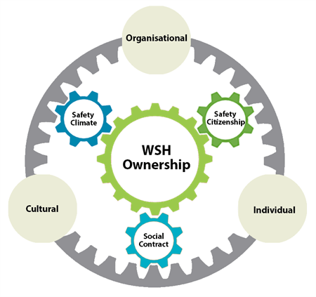 The employee-centric WSH Ownership Model is made up of three levels: individual, cultural and organisational.  The three components that drive WSH Ownership are:
