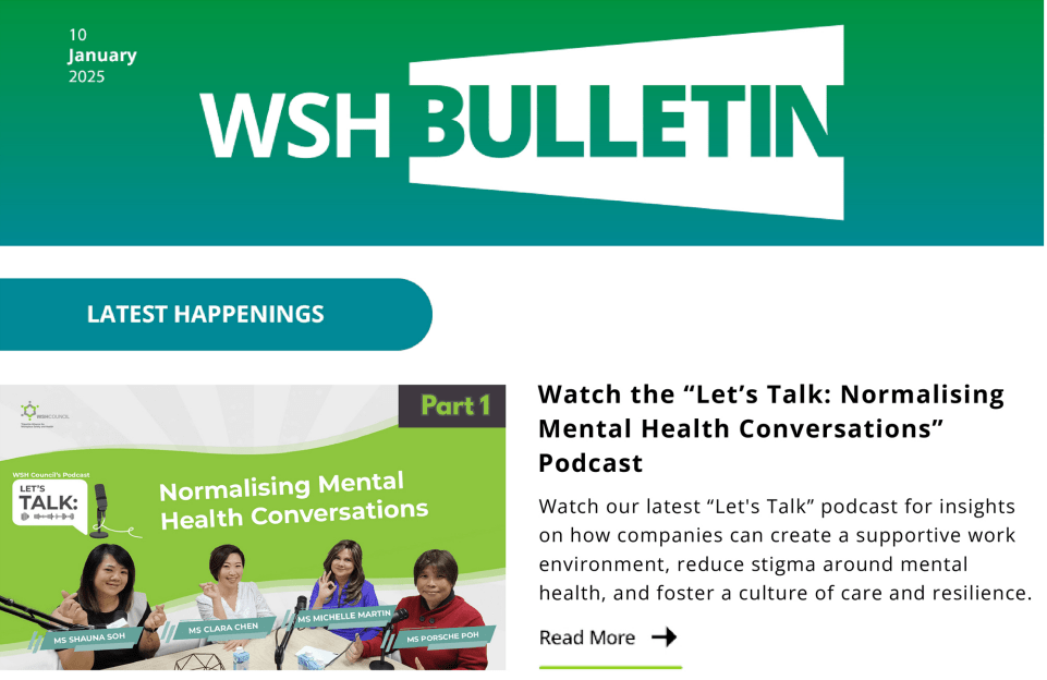Total Workplace Safety and Health (Total WSH) is an approach that looks at safety and health together at work.  It covers: