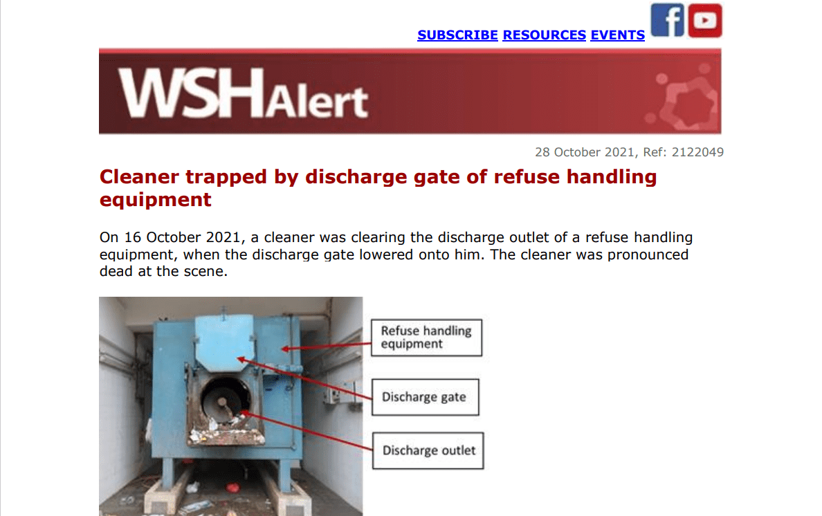 WSH alert 28 Oct 2021 Cleaner trapped by discharge gate of refuse handling equipment