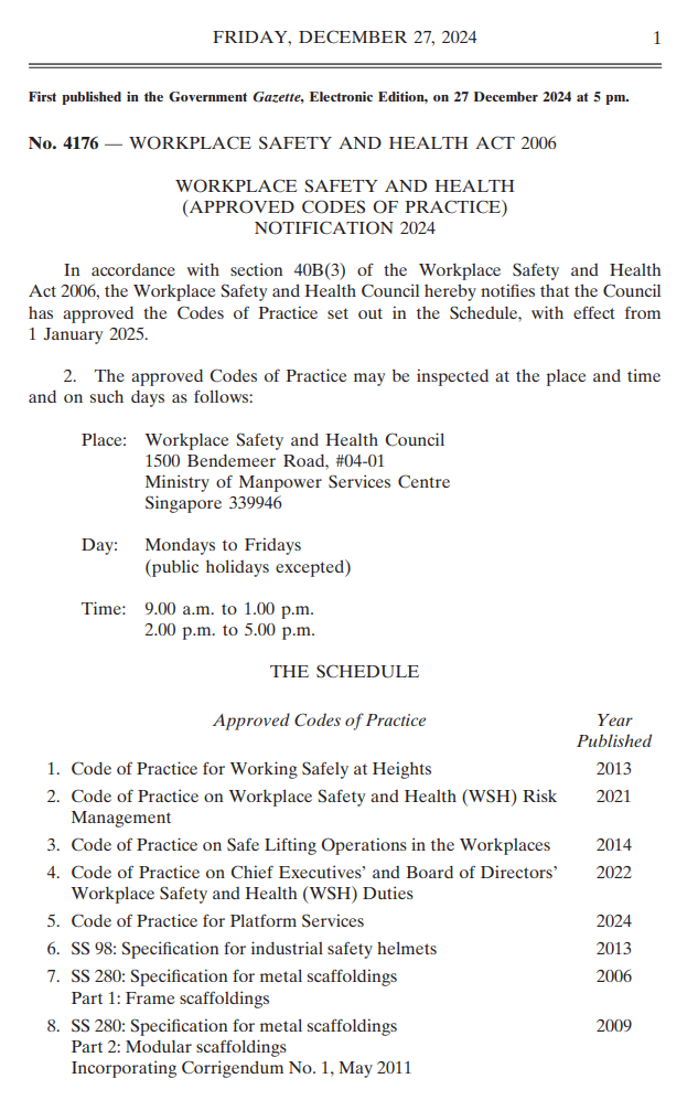 Workplace Safety and Health (Approved Codes of Practice) Notification 2024