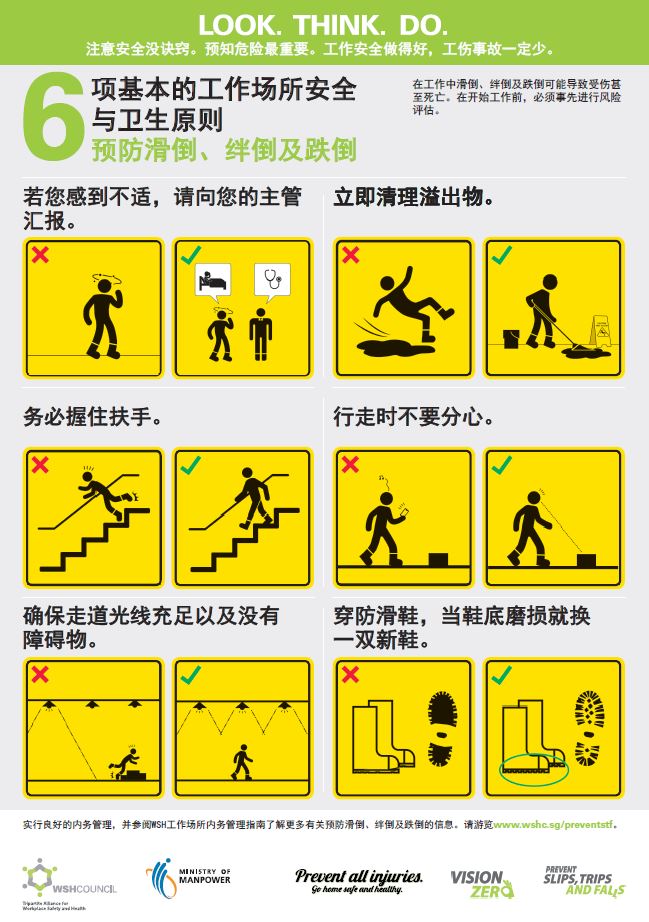 With Slips, Trips and Falls (STFs) consistently being the top cause for major and minor injuries, SMEs can refer to the SME WSH Pack on STFs to help reduce such risks at their workplace. The Pack comprises a checklist, signages and posters, and is available in English, Mandarin, Malay and Tamil.
