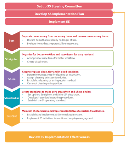 5S is a workplace organisation method based on a Japanese quality management concept that companies may use to achieve a clean and organised workplace. It provides a systematic approach to achieving good housekeeping and offers opportunities for continual improvement and enhanced productivity.